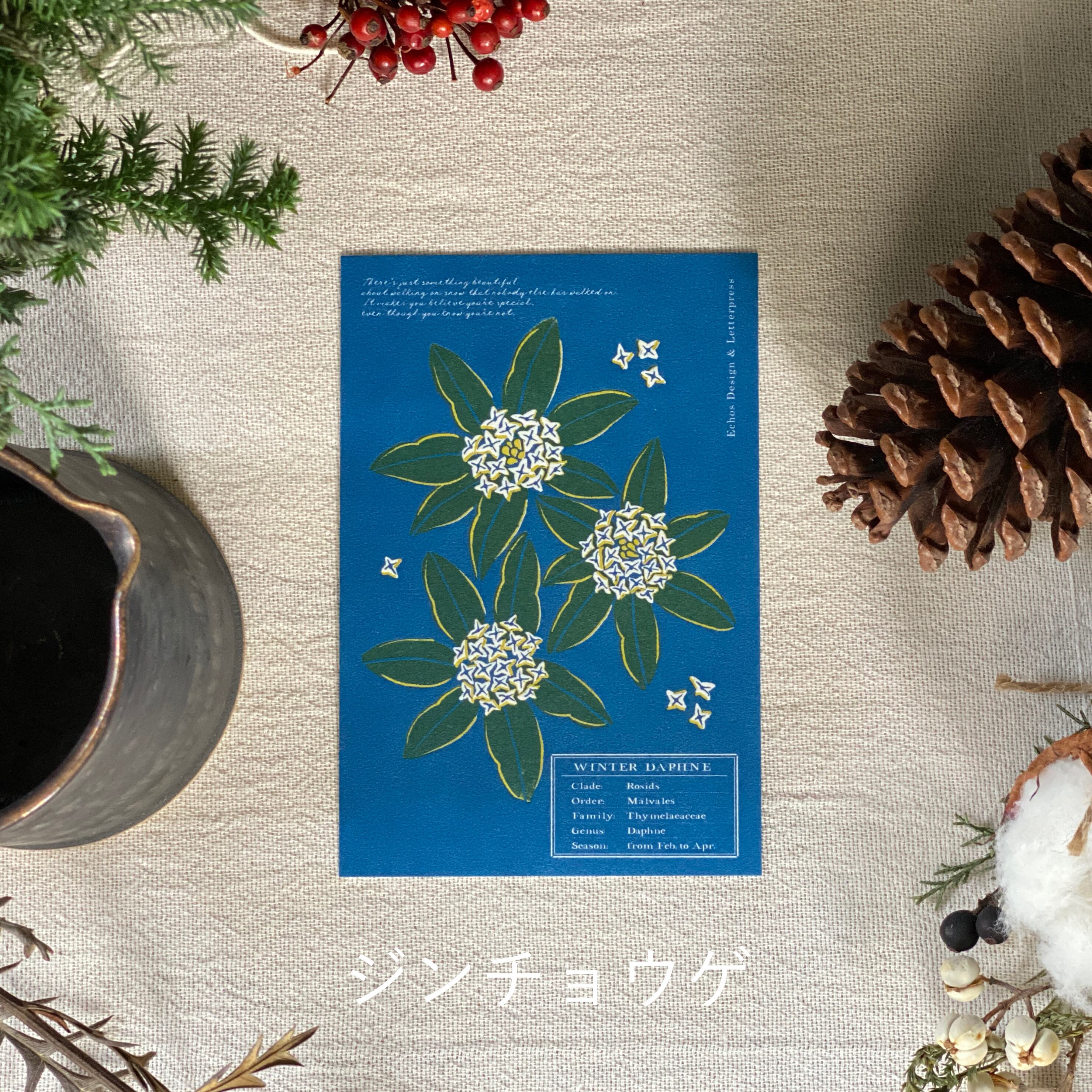 背景を活版印刷機でベタ刷りしているので、白い花の部分が少し浮かび上がるような印刷になっています。
