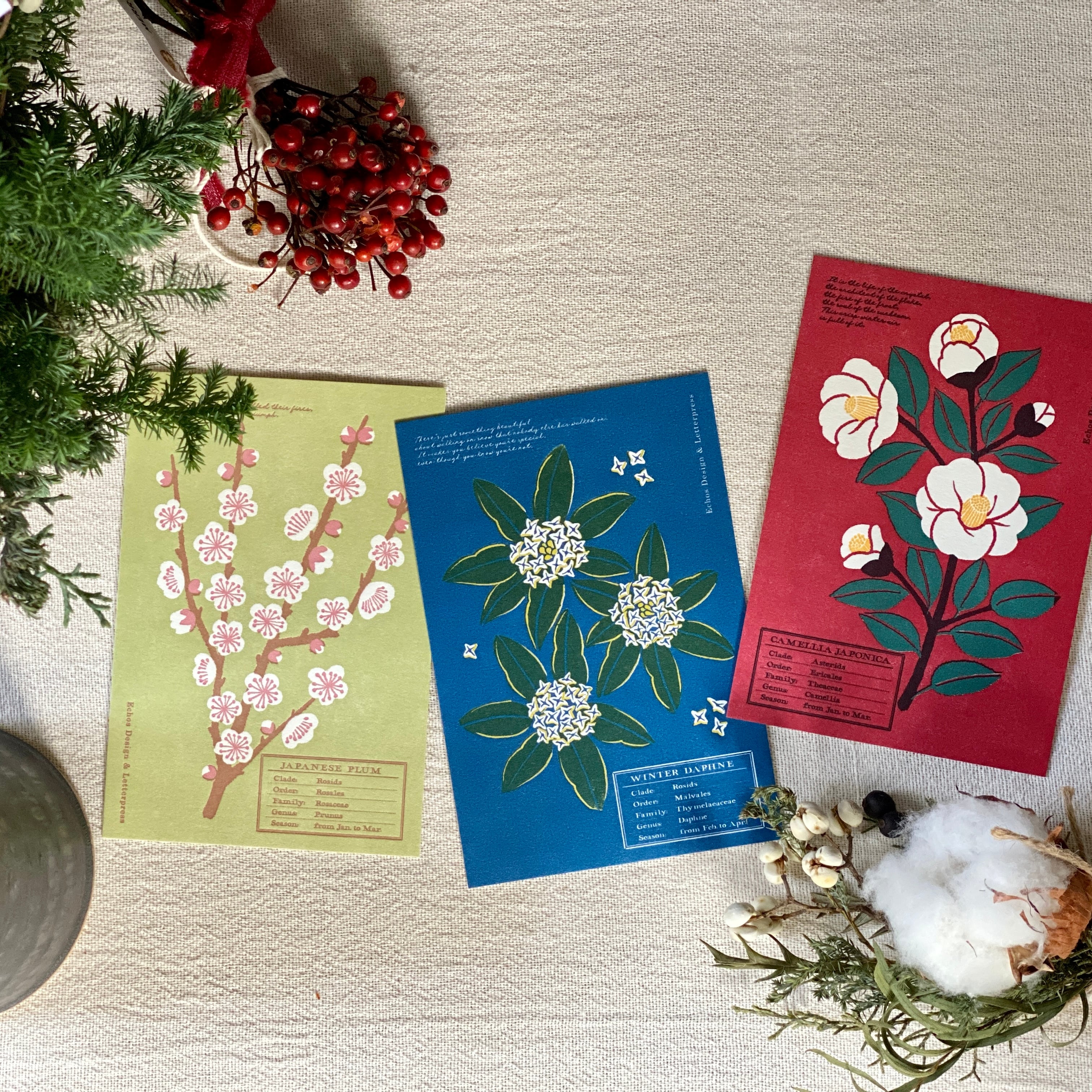 冬の花はツバキ・ウメ・ジンチョウゲがモチーフ。